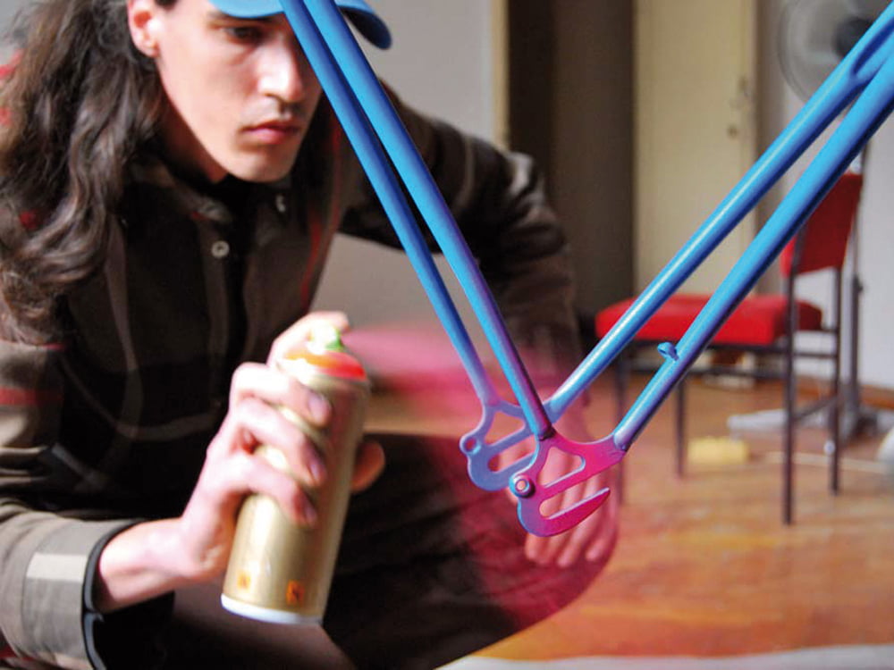A szóráshoz a vázat és a villát huzalra kell felfüggeszteni. Így jól körbejárható minden alkatrész, és egyenletesebb rétegben lehet a festékpermetet a felületekre szórni. A festék csak akkor folyik meg, ha nem egyenletesen haladva, és 30 cm-nél közelebbről lesz testesen kiszórva. Ezt jobb elkerülni! Az ilyen részek nehezen száradnak meg teljesen. A festékrétegek inkább legyenek vékonyak és megfolyás mentesek, mint testes, megfolyásokkal tarkítottak. A színre festéshez 2-3 egyenletes festékréteg szükséges, köztes 600-as vizes átpolírozás és lemosás közbeiktatásával. A használható festékek kimondottan autó zománcok lehetnek. Ezek többnyire akril alapanyagú modifikált akril spray-k, amelyek szórási távolsága 30-35 cm. Viszonylag gyorsan száradnak, ám a teljes átkeményedésükhöz 24 óra szükséges. A köztes polírozás a következő réteg jó tapadása miatt szükséges.