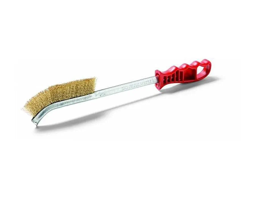 Hajlított, hosszú, speciális drótkefe rezezett, hullámos acéldrótból, műanyag nyéllel